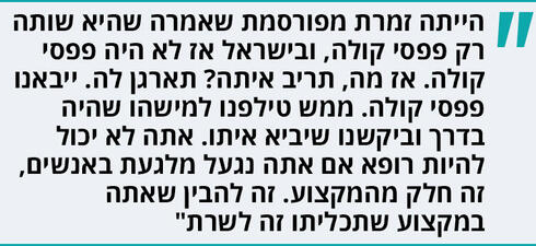 “הייתה זמרת מפורסמת שאמרה שהיא שותה רק פפסי קולה, ובישראל אז לא היה פפסי קולה. אז מה, תריב איתה? תארגן לה. ייבאנו פפסי קולה. ממש טילפנו למישהו שהיה בדרך וביקשנו שיביא איתו. אתה לא יכול להיות רופא אם אתה נגעל מלגעת באנשים, זה חלק מהמקצוע. זה להבין שאתה במקצוע שתכליתו זה לשרת אנשים”.