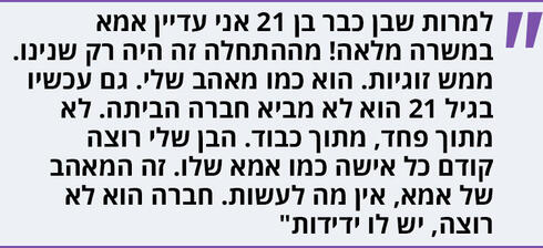 "קודם כל, הוא לא מביא חברה הביתה. לא מתוך פחד. אלא מתוך כבוד. ואם הוא יביא חברה אז הדלת שלו תהיה פתוחה. הבן שלי רוצה קודם כל אישה כמו אמא שלו. זה המאהב של אמא, אין מה לעשות. חברה הוא לא רוצה, יש לו ידידות".