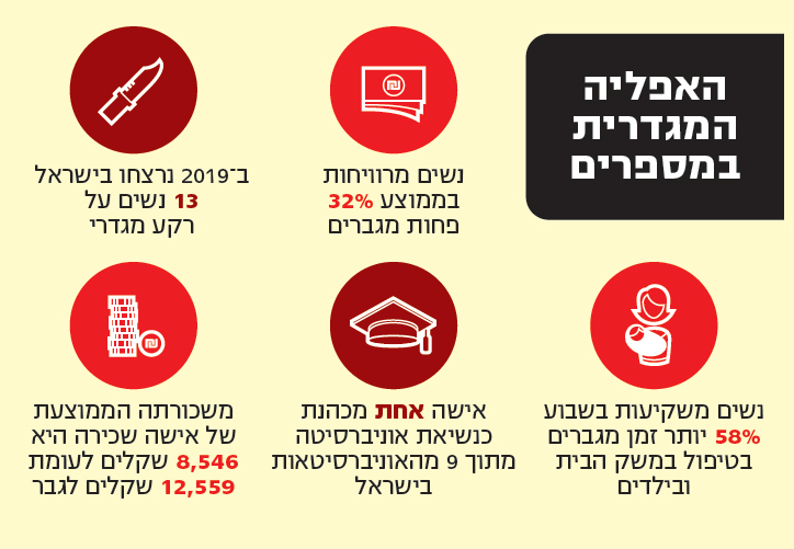 וכשזו היא רוח המפקדת, קשה שלא לחשוב על הנתונים העגומים שמתפרסמים בדוח "מדד תקרת הזכוכית של ויצו — מצבן ומעמד של נשים במגוון תחומים לשנת 2018־2019", שפורסם עכשיו במיוחד ליום האישה. אף על פי שנשים מהוות 48.4% מכוח העבודה בישראל, מעמדן בשוק התעסוקה נמוך מזה של הגברים. נכון ל־2018 נשים מרוויחות 32% פחות מגברים, ובקרב עצמאים 29% פחות. משכורתה הממוצעת של אישה שכירה היא 8,546 שקלים לעומת 12,559 שקלים לגבר. בקרב בעלי השכלה גבוהה, הנתון גבוה יותר ומגיע ל־39 אחוז הפרש. פערי שכר גבוהים קיימים גם במגזר הציבורי — שכר נשים במערכת הבריאות נמוך ב־27% אחוז משכרם של גברים, ב־24% במערכת הביטחון, ב־7% במערכת החינוך, וב־17% במשרדי הממשלה.