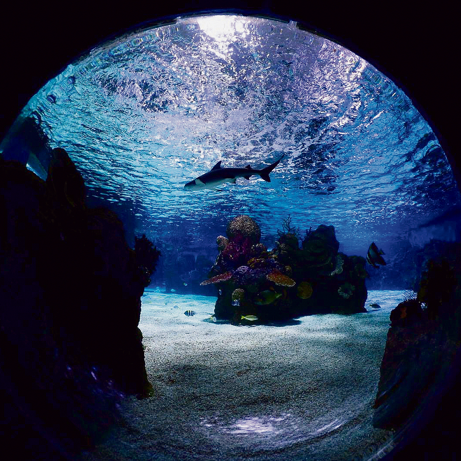 "אנחנו משתדלים כמה שפחות לגעת בבעלי החיים, ומעבר לזה הדג המסוים הזה היה נותן לך חתיכת ביס באצבע", הוא אומר ושוקע, מצטרף אליי לדממת המעמקים. אני מפנים את המסר ושומר את ידיי קרוב לגופי בעודנו שוקעים מטה לקרקעית האקווריום. סביבנו חגים דגים באינספור גדלים וסוגים, כמו להקות של ציפורים - דגי לוקוס, בורים, פארידות, ועוד. התאורה העמומה משתקפת על קשקשי הדגים כמו שמש חורפית חלשה. גודלו העצום של המכל משווה תחושה של אינסופיות.