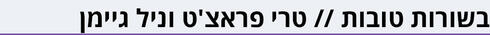 'בשורות טובות', שיתוף פעולה איקוני מ־0991 של הסופרים הבריטים טרי פראצ'ט וניל גיימן, מציג סאטירה מבריקה, עשירה ובאמת מצחיקה על דת, פוליטיקה והקיום האנושי. באלגנטיות ובהומור הוא יוצק לעידן המודרני רעיונות פילוסופיים בני אלפי שנים, ובורא עולם שלם שמתקיים במקביל לזה שלנו ומשתלב בו בצורה מהפנטת. בימים של פאניקה ובידוד מהעולם, נחמד לגלות שלא כל האפוקליפסות צריכות להיות מבאסות. (מיה אשרי)