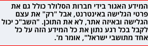 מ', בכיר לשעבר במשרד הביטחון, יוצא קהילת המודיעין, אומר שזה לא הכל, וכי המידע האגור בידי חברות הסלולר כולל גם את פרטי הגלישה באינטרנט, אבל "רק" את עצם הגלישה ובאיזה אתר, לא את התוכן. גלשתם לאתר ‘פורנהאב’, למשל? הגלישה שלכם נשמרה במאגר. אבל אם זה מרגיע מישהו, השב"כ לא יידע מה ראיתם שם. "השב"כ יכול לקבל בכל רגע נתון את כל המידע הזה על כל אחד מתושבי ישראל", אומר מ’. "ולכן הבקרה על כל זה חשובה מאוד".