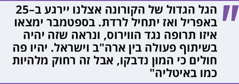 "הגל הגדול אצלנו התחיל ב־11 במארס ועד 26 במארס יידבקו הכי הרבה. זה ימשיך אבל יירגע לדעתי ב־25 באפריל ואז זה יתחיל לרדת. יכול להיות שבדצמבר זה יחזור עוד פעם אבל ראיתי שבספטמבר ימצאו איזו תרופה נגד הווירוס, ונראה שזה יהיה בשיתוף פעולה בין ארה"ב וישראל. יהיו פה חולים כי המון נדבקו, אבל זה רחוק מלהיות כמו באיטליה".