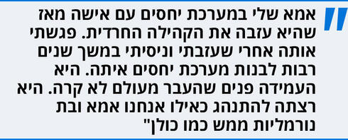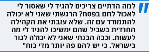 "התפלאתי, אמרתי שאני לא מבינה. חשבתי שהחרדים עושים את מה שהם רוצים והחילונים את מה שהם רוצים. למה הדתיים צריכים להגיד לי שאסור לי לאכול לחם בפסח? הרגשתי שאני לא יכולה להתמודד עם זה. שלא עזבתי את הקהילה החרדית בשביל שהם ימשיכו להגיד לי מה לעשות. וככה הבנתי שאני לא יכולה לגור בישראל. כי יש להם פה יותר מדי כוח. הייתי בארץ בדצמבר האחרון ובשבת אי־אפשר להשתמש בתחבורה ציבורית. זה נורא, הייתי בשוק".
