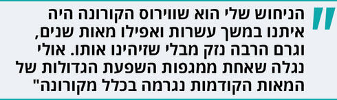 "המחלה תהיה איתנו לעתיד לא מוגבל בזמן", הוא אומר. "השאלה היא עד כמה נצטרך לשנות את אורחות החיים ועד כמה זה יהיה כמו וירוס רגיל. קח בחשבון שגם השפעת הספרדית הייתה איתנו מ־1918 עד 1957, אבל היא הרסה את העולם רק בשנתיים הראשונות. והניחוש שלי - שאני רוצה לחקור כשנתפנה קצת - הוא שווירוס הקורונה היה איתנו במשך עשרות ואפילו מאות שנים וגרם הרבה נזק מבלי שזיהינו אותו. אולי נגלה שאחת ממגפות השפעת הגדולות של המאות הקודמות - והיו הרבה כאלה - נגרמה בכלל מקורונה. צריך לבדוק מולקולרית את האבולוציה של הווירוס. אז סביר שהוא יהיה איתנו גם בעתיד, אבל כשרובנו לא נהיה חשופים לו זו תהיה הרבה פחות בעיה".