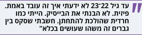 “עד גיל 22־23 לא ידעתי איך זה עובד באמת. פיזית. לא הבנתי את הבייסיק. (צועק) כי לא היה מי שיסביר! הייתי כמו חרדית שהולכת להתחתן. אם את מחזירה אותי לגיל 20 ושואלת מה אני יודע על מין את משתינה מצחוק. חשבתי שסקס בין גברים זה משהו שעושים בכלא. אני זוכר סצנה מצחיקה אחת בתור הומו צעיר בתל־אביב בדייט עם מישהו ואני שואל, ‘זה לא קצת דוחה?’ ותוך חמש דקות מצאתי את עצמי בחוץ במדרגות! ולא הבנתי למה! רציתי לצלצל אליו למחרת ולשאול אם קרה משהו”.
