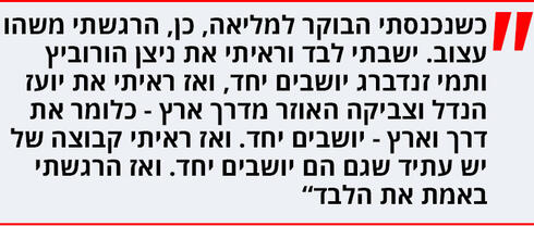 רק עכשיו, בלשכה שלה, היא מרשה לעצמה לצאת קצת מהשליטה העצמית המרשימה שהפגינה כל הבוקר. היה קשה, אני אומרת לה. "כן", היא עונה והקול שלה נסדק קצת. "אני חייבת להגיד לך שכשנכנסתי הבוקר למליאה, אז כן, הרגשתי משהו עצוב. נתחיל בזה שבגלל הקורונה הכל מוזר וממילא יושבים מופרדים ומופרדות. אבל אז ישבתי לבד והסתכלתי, ראיתי את ניצן הורוביץ ותמי זנדברג יושבים יחד, ואת יועז הנדל וצביקה האוזר מדרך ארץ יושבים יחד. ואז ראיתי קבוצה של יש עתיד שגם הם יושבים יחד, ואז הרגשתי באמת את הלבד. מאוד. יש לי יחסים מאוד טובים עם מלא מחברי וחברות הבית, אבל זה לא אותו דבר".