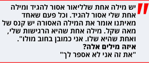 "אפרופו חבל מוחזק – יש מילה אחת שלו אסור להגיד ולי יש מילה אחת שלי אסור להגיד. וכל פעם שאחד מאיתנו אומר את המילה האסורה יש קנס של מאה שקל. מילה אחת שהיא הרגישות שלי, ואחת שהיא שלו. אני כמובן בחוב מולו".