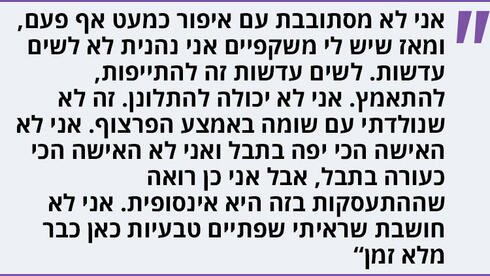 “אולי בקרוב אני ארים פה”, היא מותחת את העור ברקות וצוחקת. “סתם. לא נראה לי, יש לי כאלה טיפולי שיניים לעשות שאני כרגע לא דואגת לפנים. תראי, זאת בסך הכל באר שאני שותה ממנה, אני לא יכולה להתלונן. זה לא שנולדתי עם שומה באמצע הפרצוף. אני בסדר. אני לא האישה הכי יפה בתבל ואני לא האישה הכי כעורה בתבל, ואני בסדר מהבחינה הזאת, אני לא מתלוננת. אבל אני כן מסתכלת מסביב ורואה שההתעסקות בזה היא אינסופית. אני לא חושבת שראיתי שפתיים טבעיות כאן כבר מלא זמן”.