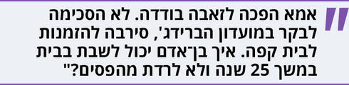 “היא לא הייתה אישה קלה והיא לא עשתה לי חיים קלים. ב־25 השנים האחרונות, מאז שאבא שלי נפטר, היא הסתגרה והשתבללה ושום דבר לא נתן לה טיפה של שמחת חיים. לא הילדים, לא הנכדים וגם לא הנינים. כל מה שעשיתי לא עבד. באחת השיחות האחרונות שלנו, כשאמרתי לה שאני מחכה לסוף הסגר כדי שסוף־סוף נוכל להתראות, אמא אמרה, ‘אתה תראה אותי בלוויה שלי’. משפט כזה קורע אותך לחתיכות”.