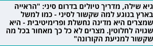 "לטעמי, כל הראייה בארץ בנוגע למה שקשור לסיני - כמו למשל שמצרים היא מדינה נחשלת ופרימיטיבית - היא שגויה לחלוטין. צריך להבין שבעיני המצרים, ולא רק בעיניהם, מצרים נחשבת למדינה החשובה ביותר בעולם הערבי. אולי זה יפליא חלק מהאנשים, אבל היא לא כל כך מאחור בכל מה שקשור למניעת הקורונה, למרות הקושי הכלכלי שלה והעובדה שרמת שירותי הרפואה במדינה אינה מהגבוהות בעולם. הם עושים את המקסימום, במיוחד נוכח העובדה שהתיירות היא מרכיב חשוב בכלכלה שלהם. הם רוצים להחזיר אליהם את מיליוני התיירים שביקרו שם קודם, בעיקר את האירופאים".