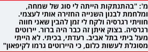 זו אולי הסיבה שמ' ובן זוגה החליטו במודע שלא להפוך להורים. "אין לי יכולת לקחת אחריות על אדם אחר, אם אני בקושי מטפלת בעצמי", היא מסבירה. "חלק מלהיות פוסט־טראומטי זה לדאוג שהילדים שלך יראו אותך בהתקף, לא להעביר לילדים את החרדות או לגדל אותם בפחד. לכן מבחינתי זה היה נון־אישיו, אמרתי אני לא רוצה ילדים וזהו. אני לא רוצה להתמודד".