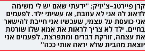 "הלכתי הפוך על הפוך", פיירטג־צ'יזיק אומרת. "ידעתי שאם יש לי משימה לדאוג לה אני לא עוזבת, אז עשיתי ילד. לפעמים אני כועסת על עצמי, שעכשיו אני חייבת להישאר בחיים. אני יודעת שהלומות קרב באחוזים שלי מסתכלות עליי בקנאה כי אני היחידה עם בעל וילד. לבנות זה עוד יותר קשה למצוא מישהו שרוצה מישהי שלא עובדת ולא לומדת, שלא תבוא אף פעם לטיולים בשבת או לג'ימבורי. ילד לא צריך לראות את אמא שלו שורטת את עצמה, זורקת דברים ומתפרצת. לפעמים אני יוצאת מהבית שלא יראה אותי ככה".