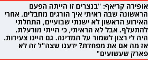 "בנצרים זו הייתה הפעם הראשונה שבה ראיתי איך הורגים מחבלים", מספרת קריאף, היום בת 37 מיבנה. "אחרי האירוע הראשון לא ישנתי שבועיים, התחלתי להתעלף. אבל לא הראיתי, כי הייתי מורעלת. היה לי רצון לשמור על המדינה. מן הסתם היינו צעירות, אז מה אם את מפחדת? ידענו שצה"ל זה לא פארק שעשועים".