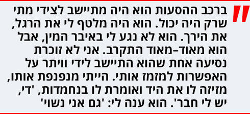 "הוא היה מתיישב לצידי מתי שרק היה יכול. הוא היה מלטף לי את הרגל, את הירך. הוא לא נגע לי באיבר המין, אבל הוא מאוד־מאוד התקרב. הכל היה מעל המכנסיים. זה היה כאילו במקרה היד שלו הגיעה לירך שלי, אבל היא פשוט נשארה שם. אני לא זוכרת נסיעה אחת שהוא התיישב לידי וויתר על האפשרות למזמז אותי. הרבה פעמים הוא מיזמז אותי תוך כדי שהוא עשה משהו במקביל, נגיד דיבר או התכתב בטלפון. הייתי מנפנפת אותו, מזיזה לו את היד ואומרת לו בנחמדות, 'די, יש לי חבר'. הוא ענה לי: 'גם אני נשוי'. ואני הרי פגשתי את אשתו ובנותיו. רציתי להקיא. אבל לפעמים זה היה ממשיך".