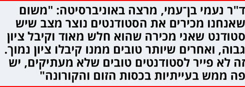 "זה שהמבחנים מקוונים, זה דבר לא פשוט בכלל", אומרת ד"ר נועה בן־עמי, מהפקולטה למדעי הבריאות באוניברסיטת אריאל. "היה לי מבחן אחד מקוון של סטודנטים שנה ג', חבר'ה ברמה מאוד גבוהה, ולדעתי הרוב לא העתיקו. מצד שני, מכיוון שאנחנו מכירים את הסטודנטים, נוצר מצב שיש סטודנט שאני מכירה שהוא חלש מאוד וקיבל ציון גבוה, אחרים שיותר טובים ממנו קיבלו ציון נמוך. זה לא פייר לסטודנטים טובים שלא מעתיקים, יש פה ממש בעייתיות בכסות הזום והקורונה. אבל אני לגמרי מבינה, כי אין ברירה אלא לעשות מבחנים מקוונים, אף אחד לא רוצה להיות צפוף באוניברסיטה ולהידבק".