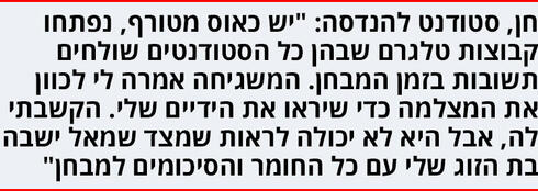 "אצלנו החליטו לעשות את כל המבחנים מקוונים, כשכל מרצה החליט על פלטפורמה משלו. מאותו רגע התחיל כאוס מטורף, נפתחו קבוצות טלגרם שבהן כל הסטודנטים שולחים תשובות בזמן המבחן. ישבתי מול המחשב עם מצלמה פתוחה, והמשגיחה אמרה לי לכוון את המצלמה כדי שיראו את הידיים שלי. הקשבתי לה, כיוונתי את המצלמה והתחלתי לפתור.