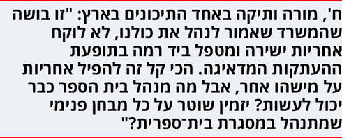 "הם פשוט מפילים את האחריות על מנהלי התיכון", אומרת ח', מורה ותיקה באחד התיכונים בארץ. "זו בושה שהמשרד שאמור לנהל את כולנו, ועוד במשבר הכי גדול שידענו במדינה, לא לוקח אחריות ישירה ומטפל ביד רמה בתופעת ההעתקות המדאיגה. הכי קל זה להפיל אחריות על מישהו אחר. אבל מה מנהל בית הספר כבר יכול לעשות? באיזה כלים ישתמש בלי הנחיות וכלים, ואולי גם תקציב מיוחד למזער את התופעה? מה הוא יעשה - יזמין שוטר על כל מבחן פנימי שמתנהל במסגרת בית־ספרית? לאן הגענו? וזו רק התחלה של מתכונת לימודים מרחוק, שלדעתי תימשך גם בשנה הבאה".