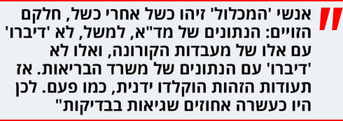 "כי תקשיבו טוב איך זה היה מתנהל: כשלמד"א היו מצטברות בדיקות, הם היו לוקחים אותן למעבדה הקרובה ביותר. הבעיה הייתה שמערכת המידע של מד"א לא 'דיברה' עם מערכת המידע של המעבדה, ולכן העבירו את מספרי תעודות הזהות של הנבדקים ידנית. כשהמעבדה סיימה את הבדיקה, היא העבירה את התוצאות למשרד הבריאות. אבל בחלק מהמעבדות, המערכות לא יודעות 'לדבר' עם המערכות של משרד הבריאות, ולכן גם שם העברת המידע הייתה ידנית. התוצאה הייתה שבימים טובים, היו עשרה אחוזים של טעויות, ולפעמים, הרבה יותר. סִפרה אחת פגומה במספר הזהות של הנבדק, וכל התהליך נהרס".