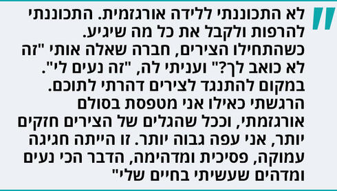 "זכיתי לחוות שלוש לידות אורגזמיות", מספרת אורית לייזרסון, אם לשלושה, מטפלת בפסיכותרפיה גופנית, מנחה למיניות יהודית הוליסטית, מלמדת הכנה ללידה מתוך עונג ומרצה במכללת רידמן ובהכשרות מטפלים אינטגרטיביות. "בלידה הראשונה עשיתי הכנה מעמיקה רגשית, פיזית ורוחנית. לא התכוננתי ללידה אורגזמית. התכוננתי להרפות ולקבל את כל מה שיגיע. תרגלתי את כל מה שאני מלמדת היום: מדיטציות נשימה, תנועה והסנפת אוקסיטוצין כדרך חיים. כשהתחילו הצירים, חברה שאלה אותי "זה לא כואב לך?" ועניתי לה, "זה נעים לי". וכך במהלך הצירים המהמתי לעצמי 'נעים נעים', 'עוד עוד', ובמקום להתנגד לצירים דהרתי לתוכם. הרגשתי כאילו אני מטפסת בסולם אורגזמטי, וככל שהגלים של הצירים חזקים יותר אני עפה גבוה יותר. זה היה פלא. התחברתי לאישה הפראית שאני כמו שלא חוויתי אותה מעולם. נהמתי, זזתי והרגשתי את שערי שמיים נפתחים דרך הגוף שלי. זו הייתה חגיגה עמוקה, פסיכית ומדהימה, הדבר הכי נעים ומדהים שעשיתי בחיים שלי. כל ממד הזמן השתנה. הגוף היה בחוויה מטריפה ואינטנסיבית, אקסטזה משוגעת. זה הרגיש כמו לעשות אהבה עם אלוהים. זה לא דומה לאורגזמה יחידה אלא מרגיש כמו אוקיינוס של עונג.