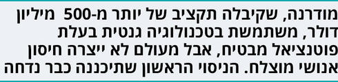 מודרנה, שכאמור קיבלה תקציב של יותר מ-500 מיליון דולר, משתמשת בטכנולוגיה גנטית בעלת פוטנציאל מבטיח, אבל מעולם לא ייצרה חיסון אנושי מוצלח. הניסוי הראשון שתיכננה כבר נדחה.