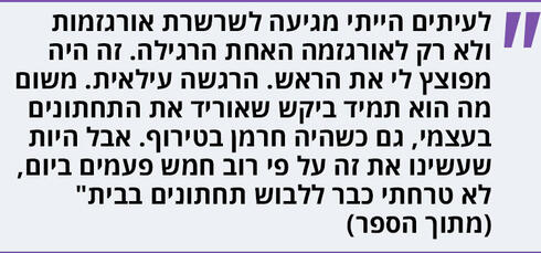 "מהרגע שנפגשנו, עשינו את זה כל לילה", היא מגלה. "אני יודעת שזה חריג. הייתה בינינו תשוקה מטורפת. אני לא יכולה להסביר את זה עד היום. לא היו פוזות יוצאות דופן, הלכנו על התנוחה המיסיונרית. לא ניסיתי לקפוץ מעליו או לעשות תרגילי אקרובטיקה, התחבקנו לאט ובנוחיות".