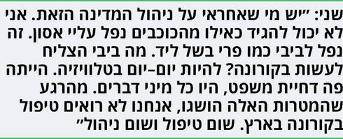 שני: "יש פה משהו שחייבים להבין. הייתה פה דחיית משפט, היו כל מיני דברים. מהרגע שהמטרות האלה הושגו, אנחנו לא רואים טיפול בקורונה בארץ. שום טיפול ושום ניהול".