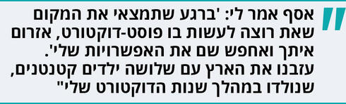"עזבנו את הארץ עם שלושה ילדים קטנטנים, שנולדו במהלך שנות הדוקטורט שלי. היינו בסטנפורד שלוש שנים ואסף עשה פוסט-דוקטורט במקביל אליי. רק לפני שנה חזרנו לארץ ובעלי השתלב בתעשייה, כפיזיקאי בקבוצת ה-CTO של חברת 'נובה', המפתחת מערכות מדידה לתעשיית המוליכים למחצה".
