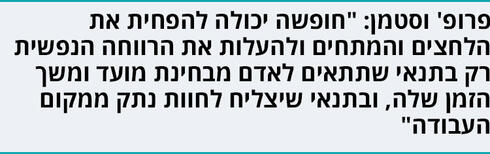 בנוגע להיבט האחרון, אגב, מציע ד"ר בן שחר להמיר את החופשה השנתית הארוכה בכמה חופשות קצרות במהלך השנה, שיאפשרו לעובדים למלא את המצברים. "ולא רק לעובדים, גם המנהל צריך לצאת לחופש. בדרך זו הוא גם מעביר לעובדיו את המסר שכולם יכולים לצאת להפוגה בת כמה ימים, ובמקביל יכול למלא את האנרגיות שהתרוקנו במהלך השגרה".