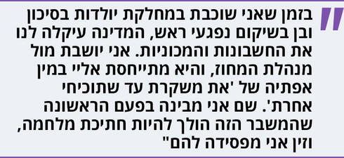 "עוד לא בשלה העת לספר את מה שמתרחש במשפט. אני כן יכולה לספר שדרך התביעה שלנו למדתי את המחירון שמערכת המשפט קבעה לחיינו. פיצוי על ילד קטן שמת גבוה משמעותית מזה שמקבלים על גבר נכה בן 30. אישה תקבל פחות מגבר אם הרוויחה פחות ממנו. קשיש נפגע מרשלנות? זה כבר שקל תשעים. כשאדם לא יכול יותר להיות אבא פעיל זה נקרא 'אובדן שירותי אב'. כמה זה שווה? רבע מיליון שקל פיצוי. זה מה שנשלם לילד על זה שלא יהיה לו לעולם חיבוק מאבא. יש לי בשכונה ג'יפים שעולים יותר. הלך לך אבא? הנה סובארו פורסטר, לא היה שווה?"