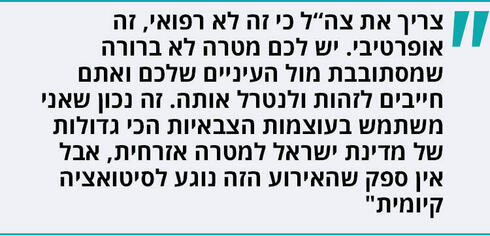 "לאף אחד לא נוח כששמים לידו אדם בכיר. אבל כרגע אין ברירה. צריך לנהל את האירוע הזה, לטובת אזרחי המדינה. ולכן, עם כל המורכבות, הוא מבין שזה צו השעה".