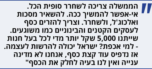 "צריך לשחרר סופית הכל. אי-אפשר להמשיך ככה. להשאיר מסכות ואלכוג'ל, ולשחרר. וצריך להזרים כסף לעסקים הקטנים והבינוניים כמו משוגעים. שייתנו 5,000 שקל יותר מדי לכל בעל חנות - למי אכפת? ישראל יכולה להרשות לעצמה. אז נדפיס עוד קצת כסף, אנחנו לא מדינה ענייה ואין לנו בעיה לחלק את הכסף".