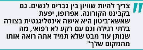 "מחדל בעיניי. צריך להיות שוויון בין גברים לנשים. גם בקבינט. אפרופו, יפעת שאשא־ביטון היא אישה אינטליגנטית בצורה בלתי רגילה וגם עם רקע לא רפואי, מה שנותן עוד מבט שלא תמיד אתה רואה אותו מהמקום שלך".