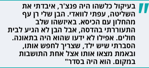 "עברתי לא מעט תאונות דרכים קשות עם אשפוזים בטיפול נמרץ. ב־1985 גרנו בגבעת זאב, נסענו לבית של ההורים שלי בערב יום כיפור, ובכיסא מאחור ישב רן, בני הבכור. בעלי היה אז תורן בהדסה. בעיקול כלשהו היה פנצ'ר, איבדתי את השליטה, עפתי לוואדי. רן עף מהחלון עם הכיסא. באיזשהו שלב התעוררתי בהדסה, אבל הבן לא הגיע לבית חולים. אפילו לא ידעו שהוא היה בתאונה. הסברתי שיש ילד, שצריך לחפש אותו, ובאמת מצאו אותו אצל אחת התושבות במקום. הוא היה בסדר.