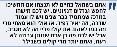 "השמאלנית הזאת בהפגנה עם הסיר על הראש, גם אותה אם הוא מחבק ואומר, 'תקשיבי יהיה בסדר, אני הפסקתי לקחת משכורת וכל ה-4,000 איי-קיו שלי עובדים עכשיו כדי להציל את זה', היא הייתה מחבקת אותו. גם היא צריכה אבא. לנתניהו אולי הייתה ואולי יש הזדמנות פז לנקות את כל הנגטיב שלו, כי זה מקרה מאוד מיוחד שבו האינטרס שלו כמותג נתניהו והאינטרס של מדינת ישראל לצאת מהברוך הנוראי הזה - הם אותו אינטרס. אז תתחיל לעבוד בזה במקום לפלג".