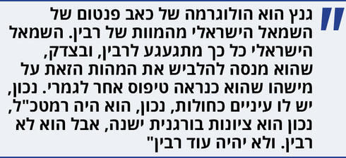 "הוא הולוגרמה של כאב פנטום של השמאל הישראלי מהמוות של רבין. השמאל הישראלי כל כך מתגעגע לרבין, ובצדק, שהוא מנסה להלביש את המהות הזאת על מישהו שהוא כנראה טיפוס אחר לגמרי. נכון, יש לו עיניים כחולות, נכון, הוא היה רמטכ"ל, נכון הוא ציונות בורגנית ישנה, אבל הוא לא רבין. ולא יהיה עוד רבין.