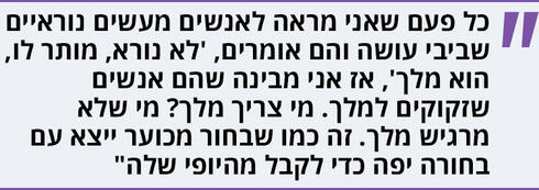 “תראי כמה שינויים עברנו מתחילת הקורונה. היית מאמינה שתראי בהפגנה בבלפור בחור ימני דתי עם דגל ישראל רטוב מהמכת"זית? לאט־לאט עוד ועוד ימנים מבינים את זה".