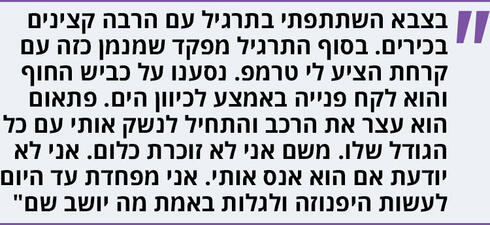 מהחוויה הזאת נשארה לה בעיקר חרטה על הרעש והמהומה שהקימה, תחושה שאולי הייתה יכולה לחסוך מאביה ז"ל את המעמד. אבל זו לא הייתה הפעם האחרונה שבה מצאה את עצמה במצב דומה. "גם בצבא נגעו בי עשרות פעמים. מפקדים שלחו יד ונגעו לי בחזה. כשכבר הייתי קצינה, השתתפתי בתרגיל בחר"פ דרום עם הרבה קצינים בכירים. בסוף התרגיל חיפשתי טרמפ לעכו והיה מפקד בכיר שמנמן כזה עם קרחת, בהיר עם עיניים כחולות שהציע לי טרמפ. נסענו על כביש החוף והוא לקח פנייה באמצע לכיוון הים, דרך השדות. לא היה ברור לי למה. פתאום הוא עצר את הרכב והתחיל לנשק אותי עם כל הגודל שלו. משם אני לא זוכרת כלום. אני לא יודעת אם הוא אנס אותי. אני מפחדת עד היום לעשות היפנוזה ולגלות באמת מה יושב שם".