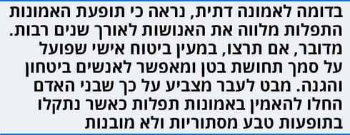 "הפעולות שאותן נשים עורכות בשם האמונה התפלה לא שונות בעיניי מחיבוק של אמא את הילד שלה לפני שהוא יוצא מהבית. זוהי פעולה שמגיעה באמונה שלמה ומתוך אהבה וכוונה טהורות, ומעניקה תחושה של הגנה וביטחון", היא מוסיפה.