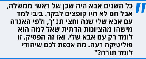 "זה מגרש המשחקים שלנו, המקום שבו לא מקבלים נבואות אלא מנהלים משא ומתן. מה שעשה את היהודים ליהודים במפגיע זה התלמוד ולא התנ"ך. כשאבא היה ילד, כולם ידעו תנ"ך. על זה התבסס האתוס הציוני. אני לא חושב שהוא דמיין שזה ייקח לו כל כך הרבה זמן. הוא סיים אחרי 48 שנה, יותר ממחצית שנות חייו".