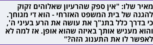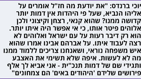 "וחז"ל גם אמרו 'אלה ואלה דברי אלוהים חיים'", היא ממשיכה. "כלומר גם 'היהודים באים', וגם יוכי ברנדס, וגם הרב אבינר - אם זה חלק מהשיח על היהדות - אלה ואלה דברי אלוהים חיים. להגיד, 'הפרשנות הזאת לא מקובלת עליי וצריך לאסור אותה', זה חותר תחת אופי היהדות".