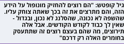 "במובן העמוק של הדברים - אתה למעשה לוקח את השטיח של הידע ומנער אותו מתחת לרגליים שלהם", אומר קופטש. "הם רוצים להחזיק מונופול על הידע הזה, והם מתרצים את זה בכך שאתה צוחק עליו. שהשפה לא נכונה, שהסלנג לא נכון, ובגדול - שאין לך כבוד לקודש הקודשים. אבל אלה תירוצים, מה שהם בעצם רוצים זה שתתעסק בחומרים האלה רק דרכם".