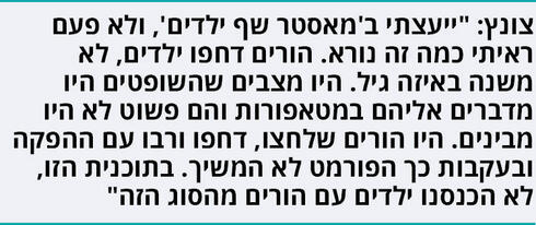 "זה בעיקר תלוי אם ההורה מרוכז בעצמו או בילד. השתתפתי ב'מאסטר שף ילדים', ייעצתי שם מאחורי הקלעים, ולא פעם ראיתי כמה זה נורא. הורים דחפו ילדים - ולא משנה באיזה גיל הם. היו מצבים שהשופטים היו מדברים אליהם במטאפורות והם פשוט לא היו מבינים. היו הורים שלחצו, דחפו ורבו עם ההפקה ובעקבות כך הפורמט לא המשיך. בתוכנית הזו, לא הכנסנו ילדים עם הורים מהסוג הזה. לא רצינו שזה יהיה ממקום של משמעת וכעס. היו ילדים עם סיפורי חיים קשים בלי כוחות להתמודד איתם, הם לא נכנסו".