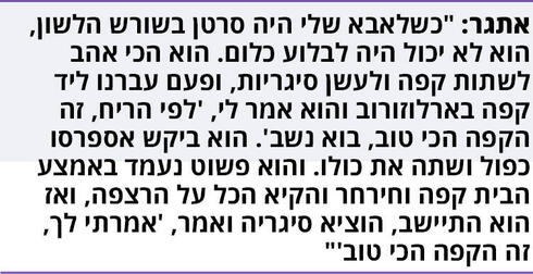 "אמרתי לה שאני לא מבין בזה. הצעתי שנמכור, והיא אמרה לי, 'איך אתה מדבר? אבא שלך עבד והשקיע'. כל האינטראקציות סביב זה היו נוראות, כאילו תרמתי כליה בלי הרדמה. אנשים מדברים איתי על פרצלציות ואני לא מבין, משקרים לי בפנים, באים עם משפטי פתיחה כמו 'חבוב, כאן זה לא סיפור קצר' או 'וואללה, אני לא מאמין איך לבן אדם מדהים כמו אבא שלך יצא ילד כזה אפס', שהיה הכי אהוב עליי כי אחריו תמיד הגיע סיפור על אבא שלי שחשף צדדים שלא הכרתי".