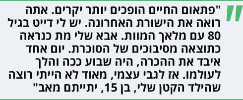 "אני גדלתי עם חינוך של 'תמיד תשים כסף בצד ליום סגריר'. זה משפט של ההורים, שבחברה הישראלית הצעירה לא קיים. אתה רואה אנשים בענף שלנו עם מכוניות חדשות, חיים על תזרים. ברגע שזה נעצר, יש קריסה. אבל אנחנו במדינה שמחנכת ילדים בני 18 לקבל נשק ואומרת להם תסתער, למרות שהמוות אורב".
