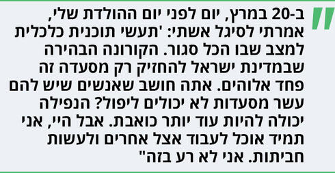 "יש לי 300 עובדים, אמרתי להם, 'אין ברירה, חבר'ה, הולכים הביתה'. אתה מדבר לדור שהוא ברובו צעיר ומעולם לא חווה משבר. אנחנו עברנו אינתיפאדות ופיגועים ו'צוק איתן', ואני יודע מה זה לראות מסעדה ריקה ותחת משבר, יודע שצריך להוריד את הראש עד יעבור זעם ושנצא מזה. אבל עדיין לא תיארתי לעצמי את העוצמה של הקורונה".