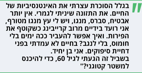 "אני נורא עצוב. בחיים לא עמדתי בפני דחיית סיפוקים. אני בן יחיד, אמא שלי תמיד הייתה אומרת, 'תיקח מה שאתה רוצה, תאכל מה שאתה רוצה'. פתאום החיים התהפכו עליי לגמרי. זה שוק. שמע, הרי אוכל הוא כל מהות החיים שלי. בשביל זה הגעתי לגיל 60, כדי להיכנס למשטר קטוגני? זה גרוע מאוד, סעמק".