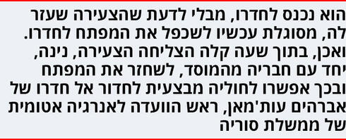 הוא נכנס לחדרו, מבלי לדעת שהצעירה מסוגלת עכשיו לשכפל את המפתח לחדרו. ואכן, בתוך שעה קלה הצליחה הצעירה, נינה, יחד עם חבריה מהמוסד, לשחזר את המפתח ובכך אפשרו לחוליה מבצעית לחדור אל חדרו של אברהים עות'מאן, ראש הוועדה לאנרגיה אטומית של ממשלת סוריה.