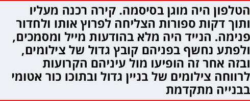 הטלפון היה מוגן בסיסמה. קירה רכנה מעליו ותוך דקות ספורות הצליחה לפרוץ אותו ולחדור פנימה. השניים עברו על תוכנו של הנייד, שהיה מלא בהודעות מייל ומסמכים, ולפתע...