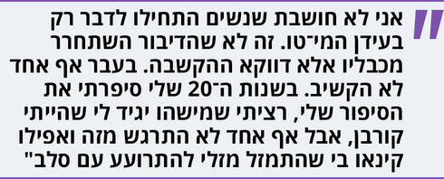 "כן ולא. זה יותר מורכב מזה. אני לא חושבת שנשים התחילו לדבר בעידן המי־טו. זה לא שהדיבור השתחרר מכבליו אלא דווקא ההקשבה. בעבר אף אחד לא הקשיב. כשהייתי בשנות ה־20 שלי סיפרתי לאנשים את הסיפור שלי אבל אף אחד לא התרגש. כולם חשבו שזה נורמלי ואפילו נהדר, ואני הפנמתי את זה וחשבתי שאכן קרה לי דבר מופלא. שסיפור האהבה הראשון שלי הוא סיפור של חניכה מינית ואינטלקטואלית מדהימה. אבל האמת היא שסיפרתי את זה לאנשים סביבי כדי לקרוא לעזרה. רציתי שמישהו יגיד לי שהייתי קורבן. אבל פרט לטיפול הפסיכואנליטי שעברתי, איש בסביבתי לא שיקף לי ככה את הדברים. אפשר להגיד שאפילו קינאו בי שזכיתי לעבור חוויה כל כך לא שגרתית, שהתמזל מזלי להתרועע עם סלב".